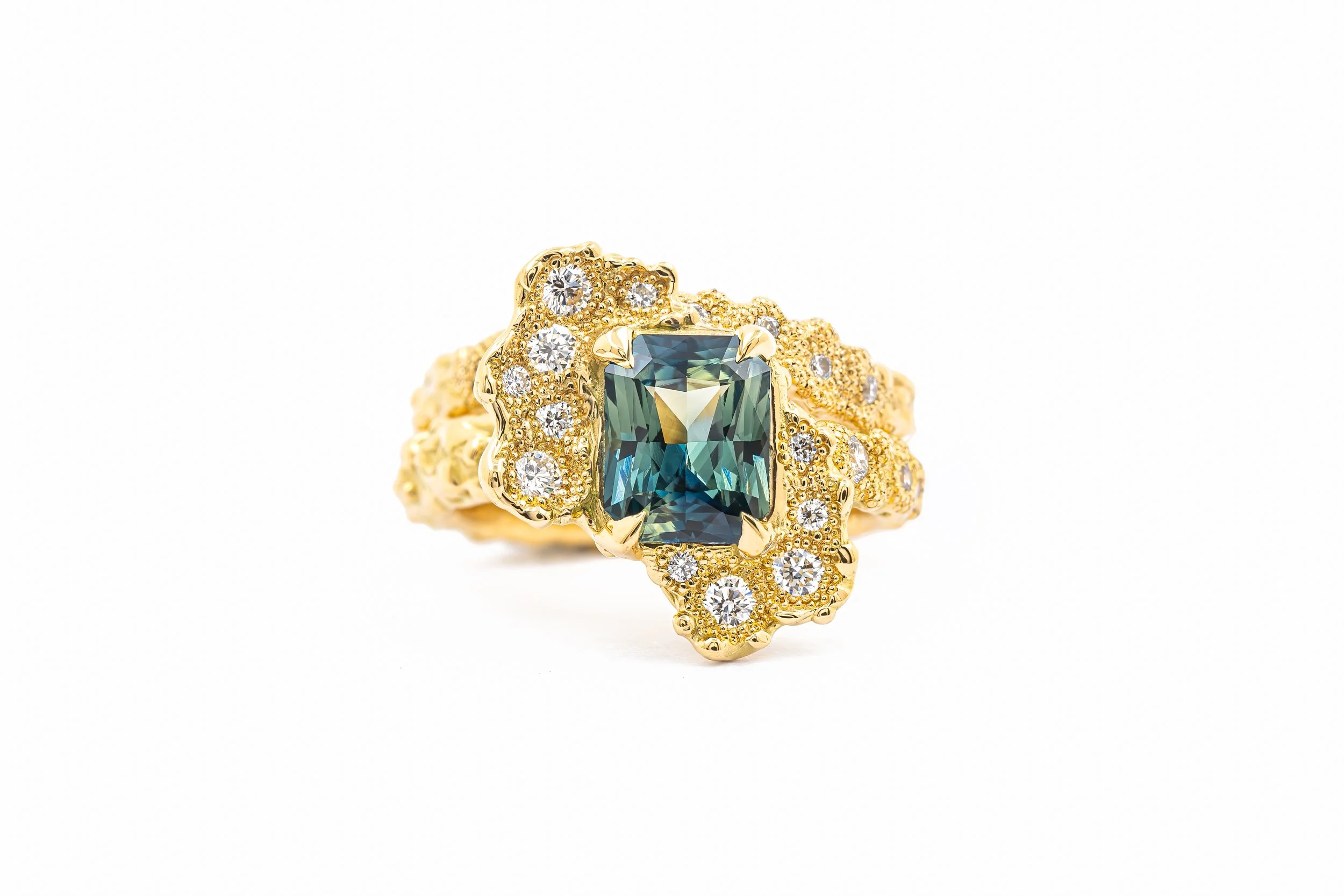 Our one-of-a-kind creations combine precision handcrafting with precious materials: elegant peach sapphires in scintillating seas of gold and natural diamonds, breathtaking teal sapphire rings with refined textured surfaces, sublime parti sapphires flashing hues of blue and green, and unique forms with gold terrains to adorn your body.